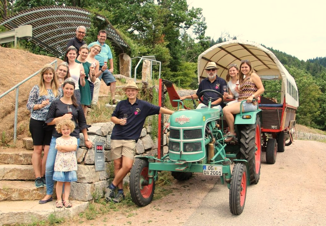 Mit dem Winzer in den Weinberg, Platz nehmen im Planwagen und die schöne Landschaft, den Wein und ein gutes Vesper genießen.